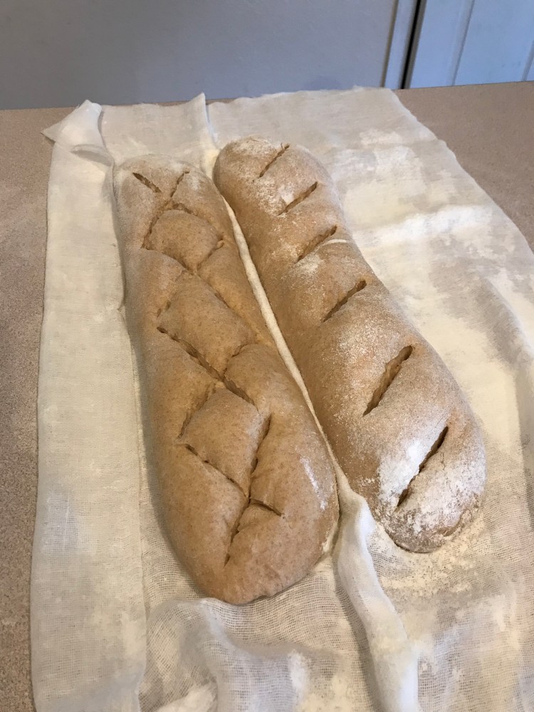 Given my time crunch and lack of shaping skills, everything looked ok so I went ahead to the scoring stage. You want to score the dough not just for decoration but to allow for expansion as the bread bakes. The tool of choice for bakers is called a lame pronounced “lahm.” It means “blade” in French apparently. It kind of looks like a razor on a stick. I don’t have one. Yet. I’m ordering one soon. You can use a very sharp knife and though the knife I used was sharp, I think maybe I shouldn’t have use the serrated one. Live and learn. I tried to get all fancy with alternating slits and cross crosses, but it looked a mess. Ok. Maybe that’s extreme, but I’m still learning so I give myself a pass. See for yourself.