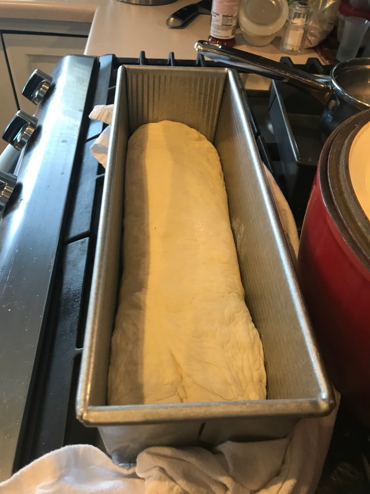 I was worried about this recipe for several reasons. I don’t know if it was the French name (it’s white sandwich bread essentially) or the fact that I had to use a Pullman pan – which up until this recipe I had never heard of – but worried I was. Oh yeah. And the maths. There was lots of maths. (I know math doesn’t need an “s” at the end but it’s how I’m saying it. It’s more fun.) So as I’ve had to do with all of these recipes, I’ve needed to size the servings down. This one was the biggest conversion yet. The recipe as written in The Book yields 37 plus pounds of dough which is supposed to make 15 three-pound loaves of bread. Fifteen!! Up until this point, I’d been dividing my recipes by 4 and just seeing what happened. I certainly didn’t need to make that many loaves plus my stand mixer could never hold 20 pounds of flour! I realized I needed to think about this another way and started looking online. I did additional calculations by dividing by eight but then I wasn’t sure I wanted to deal with two loaves as I only have one pan. Decisions. I started reading about baker’s percentages and then finally clued in on how to use that information in The Book. It was right there all along.