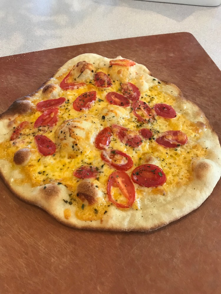 I won’t go too crazy with the review. The recipe was spot on. I was pleased with how easy the dough came together. I’d definitely make it again. I do have one recommendation if you’re going to make pizza on the regular. Get a pizza peel which is really a huge spatula to put a pizza into and out of the oven and can serve double duty as a cheese/charcuterie board. (I love those things with fancy red wine). I struggled without one because once I got the dough ready with toppings, I couldn’t get it off the counter or cookie sheet. By the fifth pizza, and with the bamboo pizza peel I bought off of Amazon, I got a rounder, more uniform look and bake. It was a pretty good feeling.