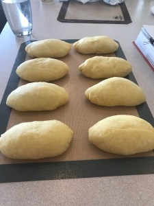 After weighing, each dough ball was shaped into a batard which is a bread roll shape that is oblong and oval in shape. The dough then rests for a bit before you start to roll out the strands for the braids. Notice that I made enough dough to make two loaves plus two extra to do something with.