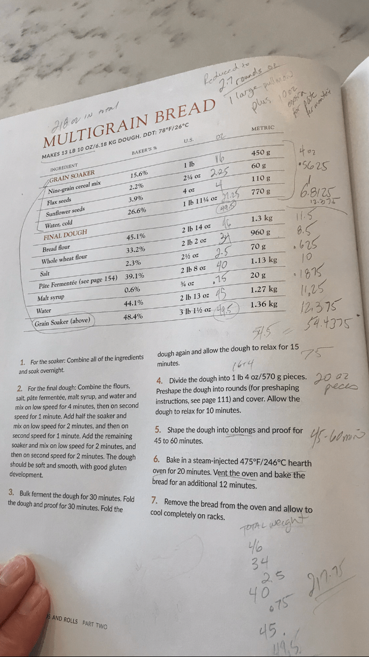 This weekend I am jumping back in. I’ve decided to skip the last recipe in chapter 1 (jelly donuts) for now and start chapter 2, Advanced Yeast Breads and Rolls. The first recipe is for a multigrain bread which uses a soaker AND something called a pâte fermenteé. A soaker as far as I can tell is simply some grains and seeds in a liquid that are left to soak and expand for a period of hours or sometimes days. The reason to do this is that some grains are very dense and can suck the moisture out of your bread so this ensures the grains have soaked in the moisture and will help not hinder gluten development. A pâte fermenteé (“old dough”) is pretty much leftover dough that has fermented for at least 6-8 hours if not more in the fridge that is then added into the fresh dough mixture. I think it’s done to add flavor and richness. I aim to find out. To complicate things, I’m going to try this recipe at high altitude – 8200 feet – in a kitchen that isn’t mine and I’m going to knead it by hand. Girls weekend. Stay tuned. I hope I’ve figured out the correct measurements.