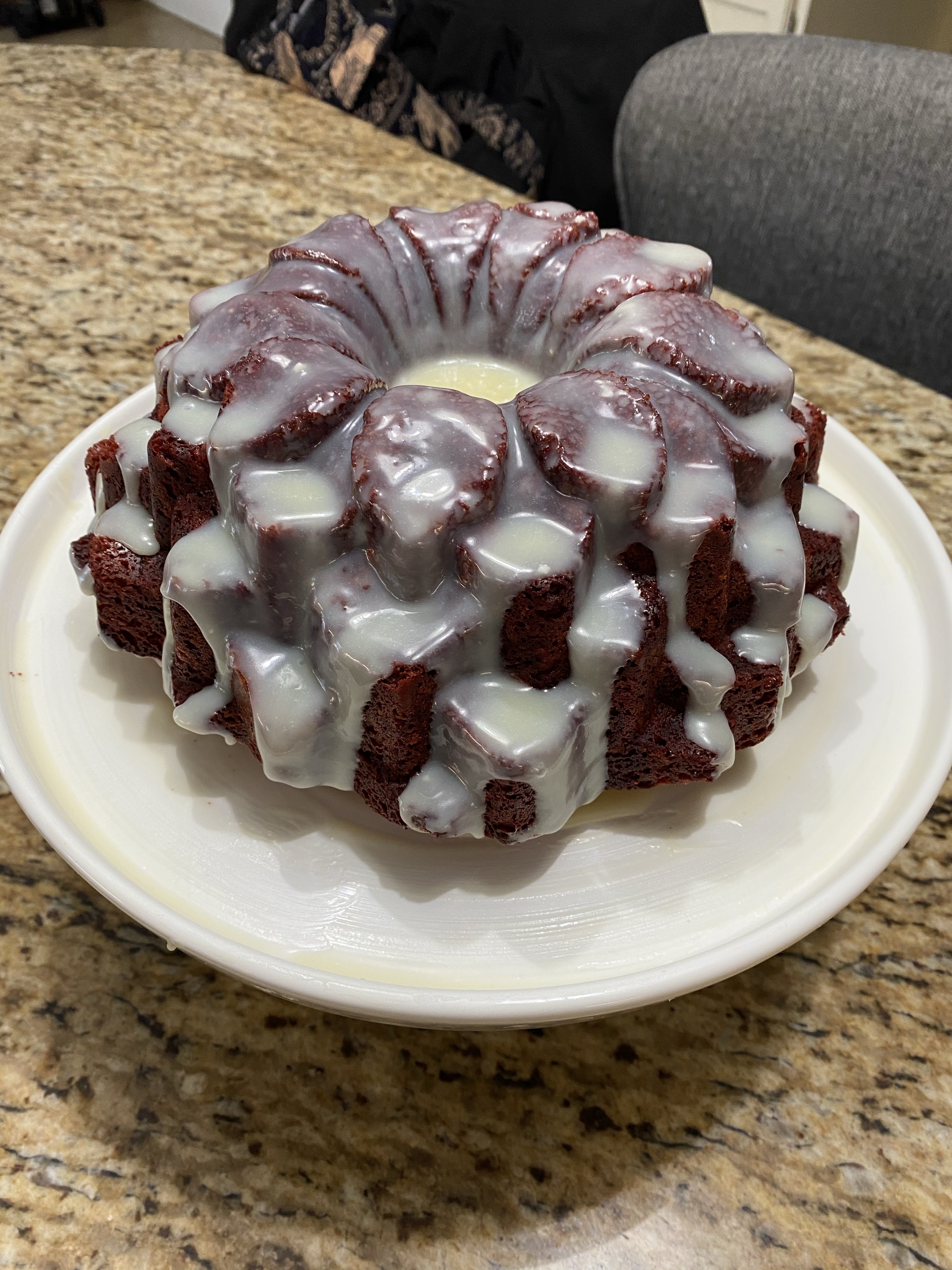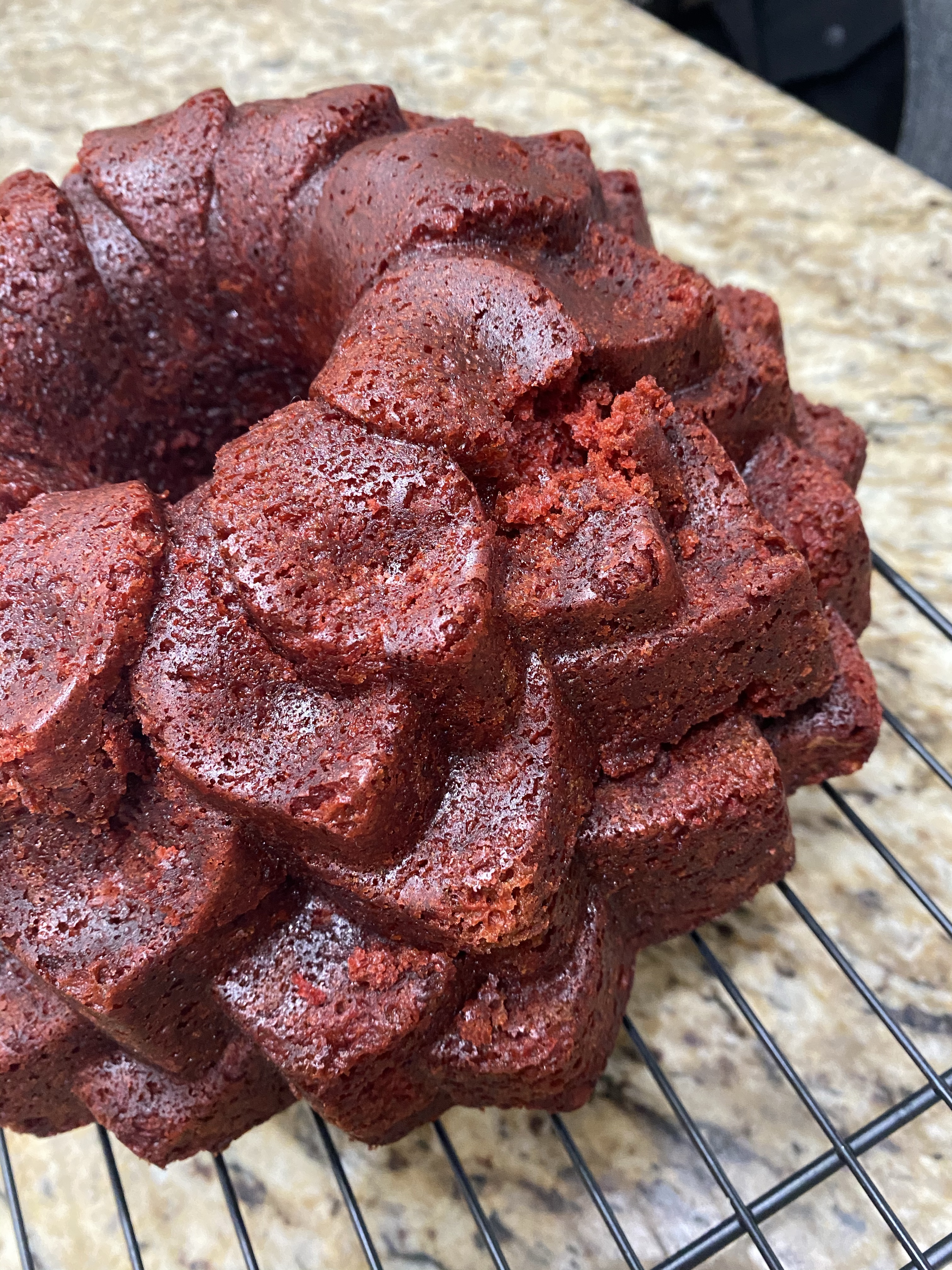 I slathered shortening inside the bundt cake pan and prayed the cake would release. I should have floured it, too. Oh well. Most of it came out. I baked it a little too long because the middle didn’t seem quite finished, but in doing so dried out the sides. Thankfully most of the cake released and the small bit that was stuck came out in one chunk. I just pushed it back onto the cake like it were a puzzle piece fitting into its place. You can see in this image where I did that. It didn’t look bad overall though so that was a relief.