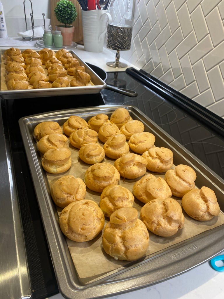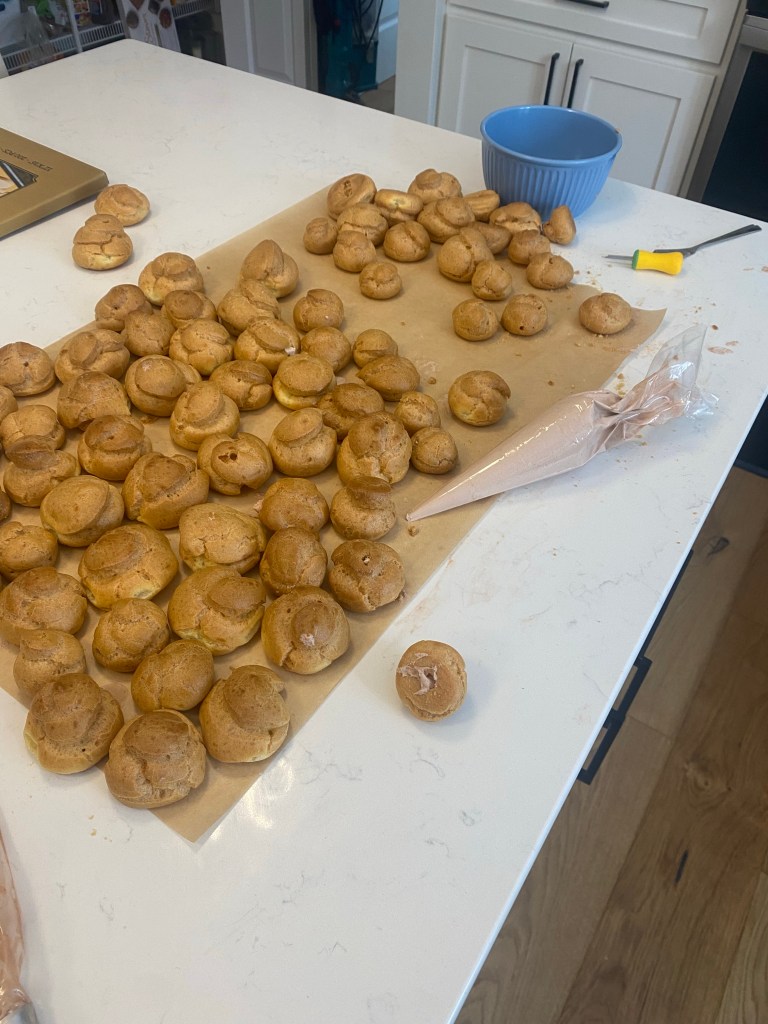 I made the dough several days in advance which I’d do again though I’d store it differently if I weren’t making it all on the same day. Ah the pâte à choux. I love to say it – so French. This is the type of pastry dough used for cream puffs and eclairs. It came together much easier than I thought. It’s an interesting dough as you cook it on the stovetop and then you use the stand mixer to beat and cool off the dough before incorporating a sh*t ton of eggs (11 large in my recipe) until it’s smooth and silky and ready to pipe into shapes – in this case 1-1.5 inch circles. When they bake they puff up in the oven. I should have used a template, but I was lazy. I just made as many puffs as I could from the recipe I used. I had about 70 puffs I think.