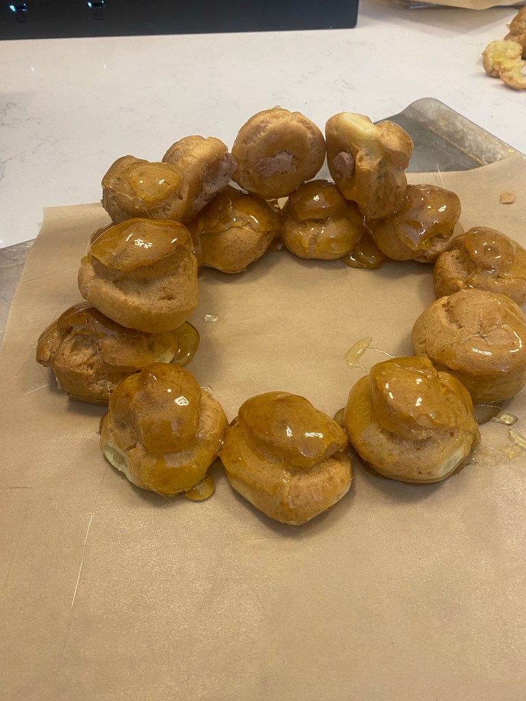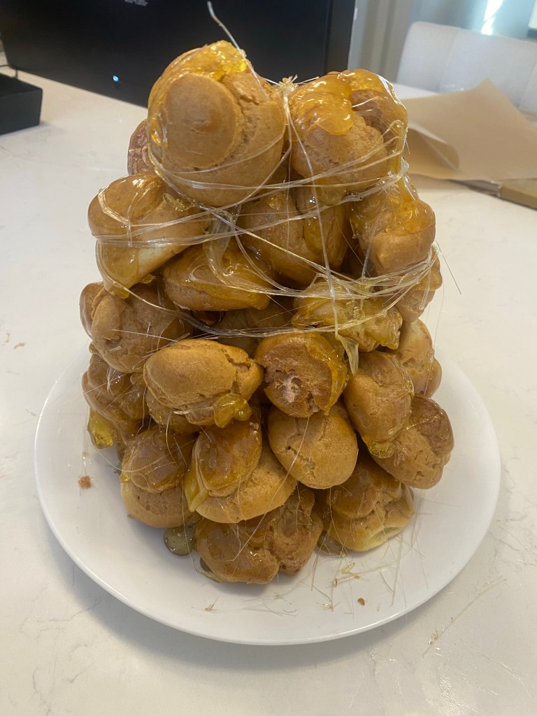 A croquembouche is a French dessert typically made for weddings or celebratory occasions. It’s essentially a tower of caramel-covered cream puffs embellished with thin strands of spun sugar (the caramel). In my opinion it kinda looks like a Christmas tree. It has a round base and is large at first but tapers into the shape of an inverse cone – skinny on top, round on bottom. I’ve been talking about making one for years. I decided this year I was doing it. I posted on social media about doing it. I had to. It was time. But, I ran out of time. (More on that later.)